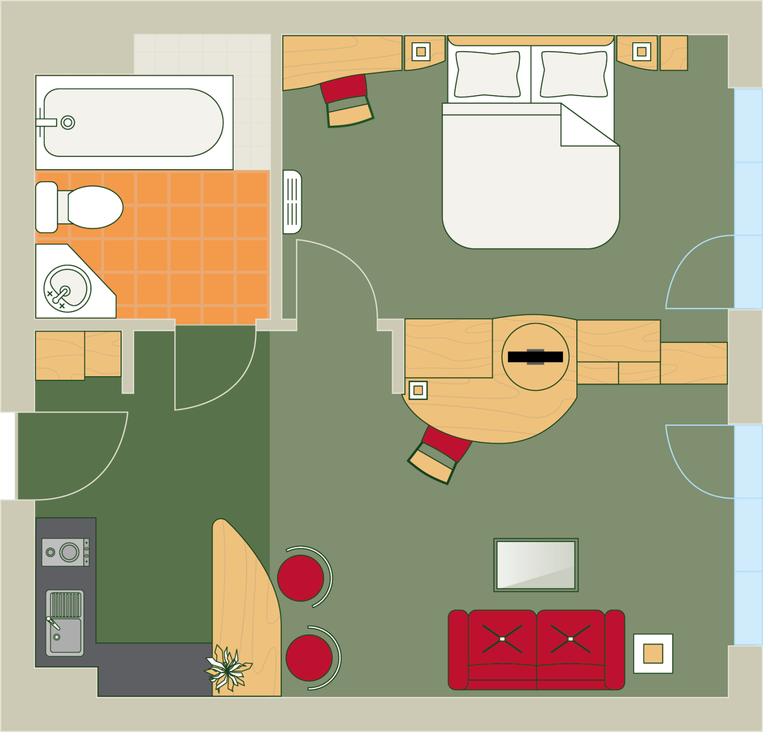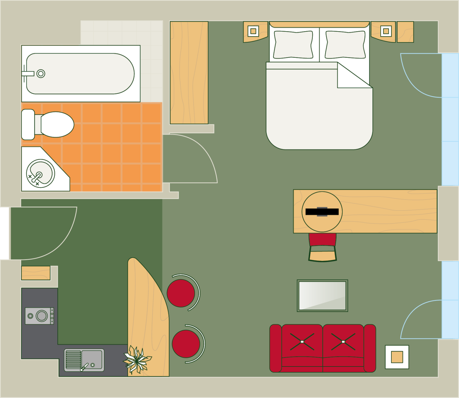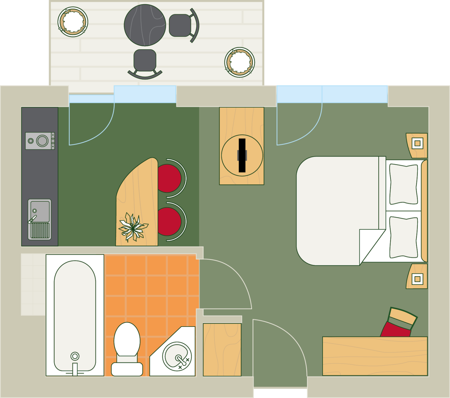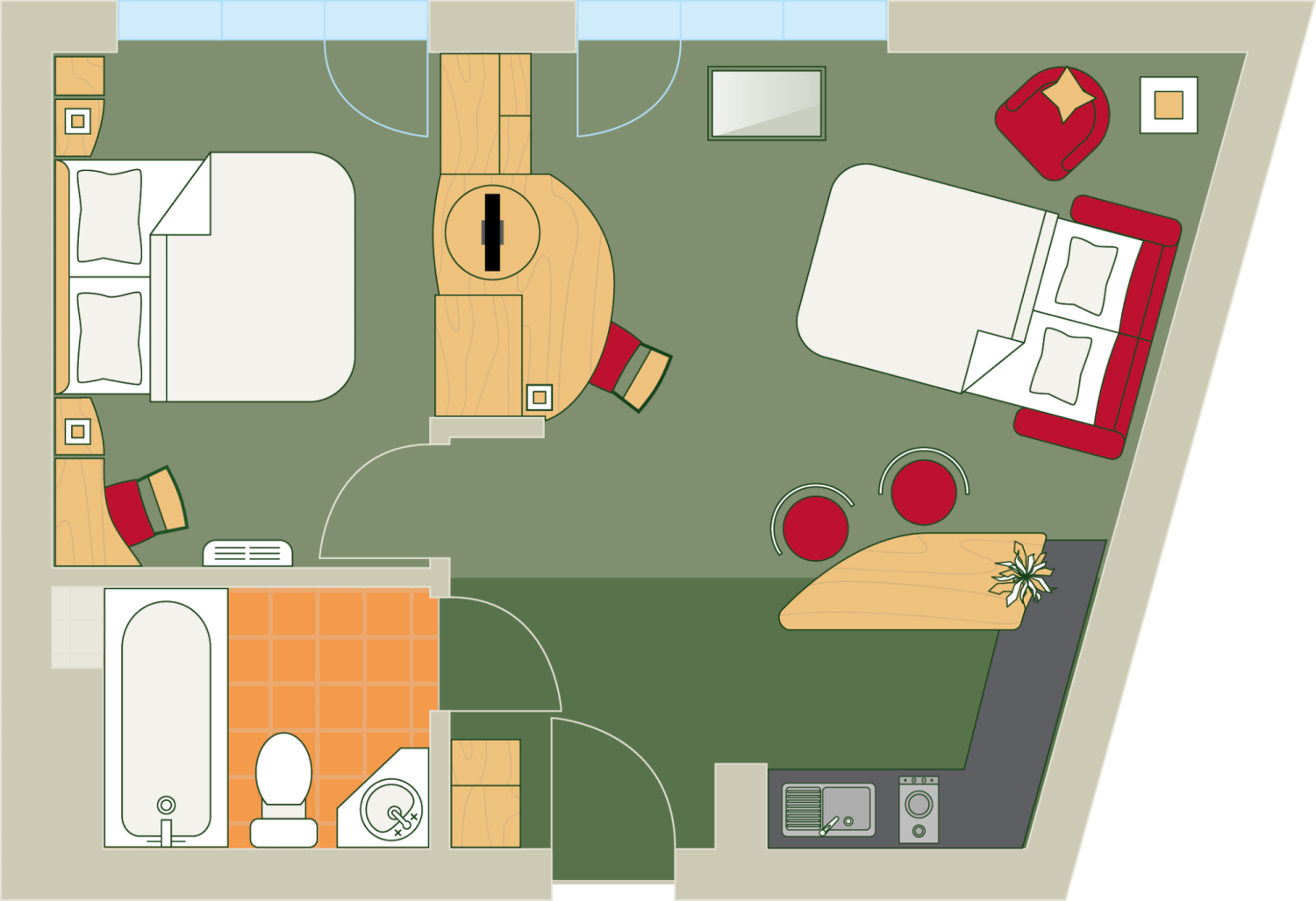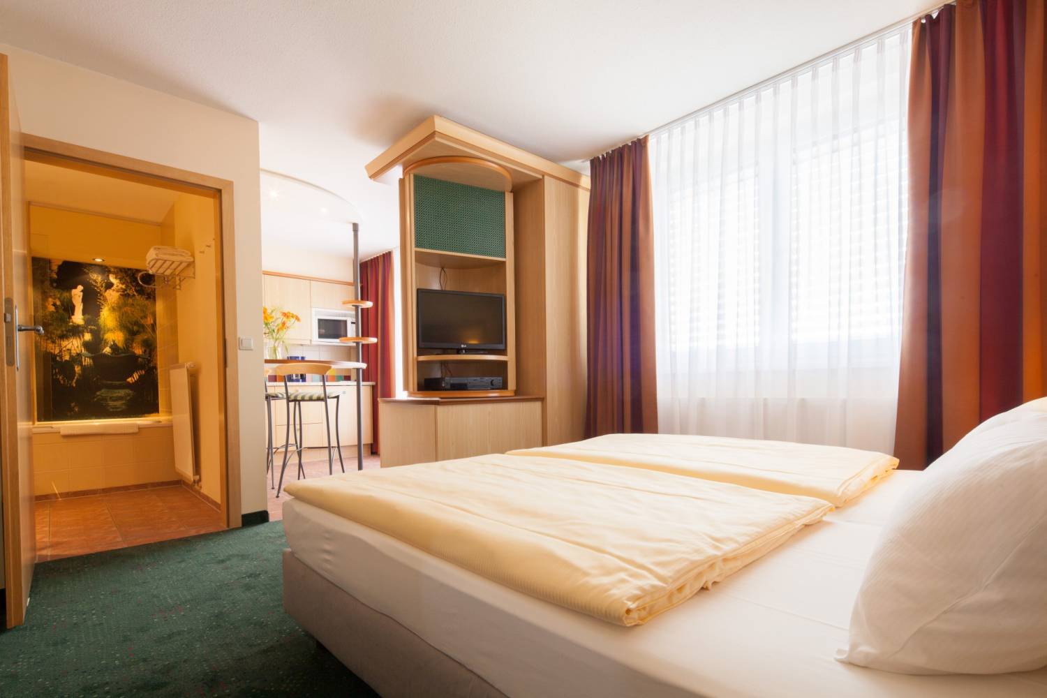 - gemütliche Ein-Zimmer-Suiten und geräumige Zwei-Zimmer-Suiten